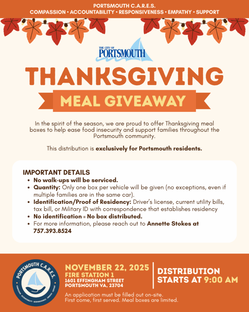 Thanksgiving Boxed Meals – Portsmouth Residents Posted on November 19, 2025 by admin Note the requirements: Portsmouth residents only (one box per vehicle) No “walk-ups” (you must fill out an application on site, providing identification) While supplies last.